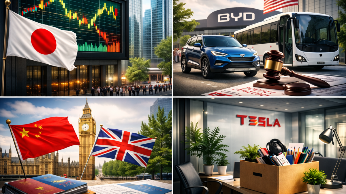 Global markets and corporate developments delivered a mixed set of signals on Tuesday, as investors weighed political shifts in Asia, trade disputes involving major manufacturers, diplomatic tensions between China and the United Kingdom, and leadership changes at a prominent electric-vehicle maker.
